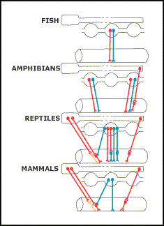Figure 11.4. Diagrammatic representation of the autonomic cholinergic excitatory (red line), adrenergic (yellow line) and nonadrenergic inhibitory (blue line) nerves to the stomach of vertebrates. (From Burnstock 1969).